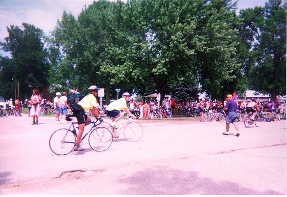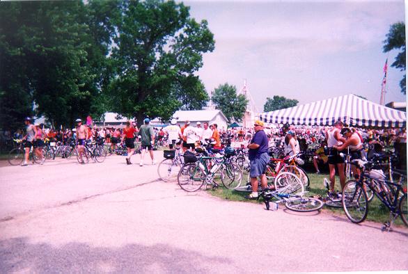 The two images below show what a typical small town street corner looked like when 15,000 bicycle riders came through town on a hot July afternoon.