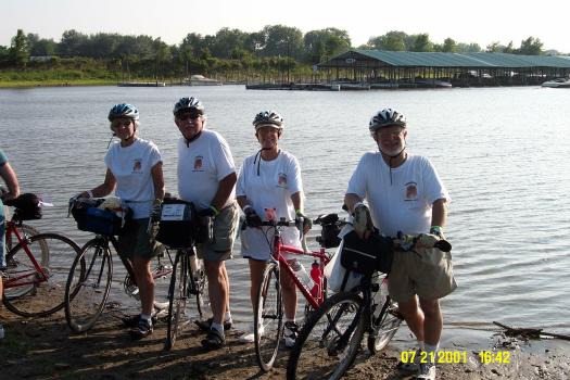 The dipping of rear wheels in the Missouri River in Souix City in July 23, 2001 (left to right: Kay Lettington, Tom Lettington, Stephanie Stubbs,